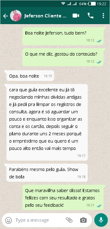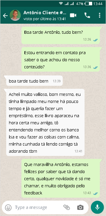 Eu acredito tanto que este e-book irá te gerar um ótimo resultado que te ofereço uma garantia de 7 dias para você experimentar o conteúdo. Se você não ficar satisfeito com o conteúdo ou se você se arrepender por qualquer outro motivo, basta me enviar um e-mail e eu devolvo 100% do seu dinheiro. Sem questionamentos e sem burocracia.